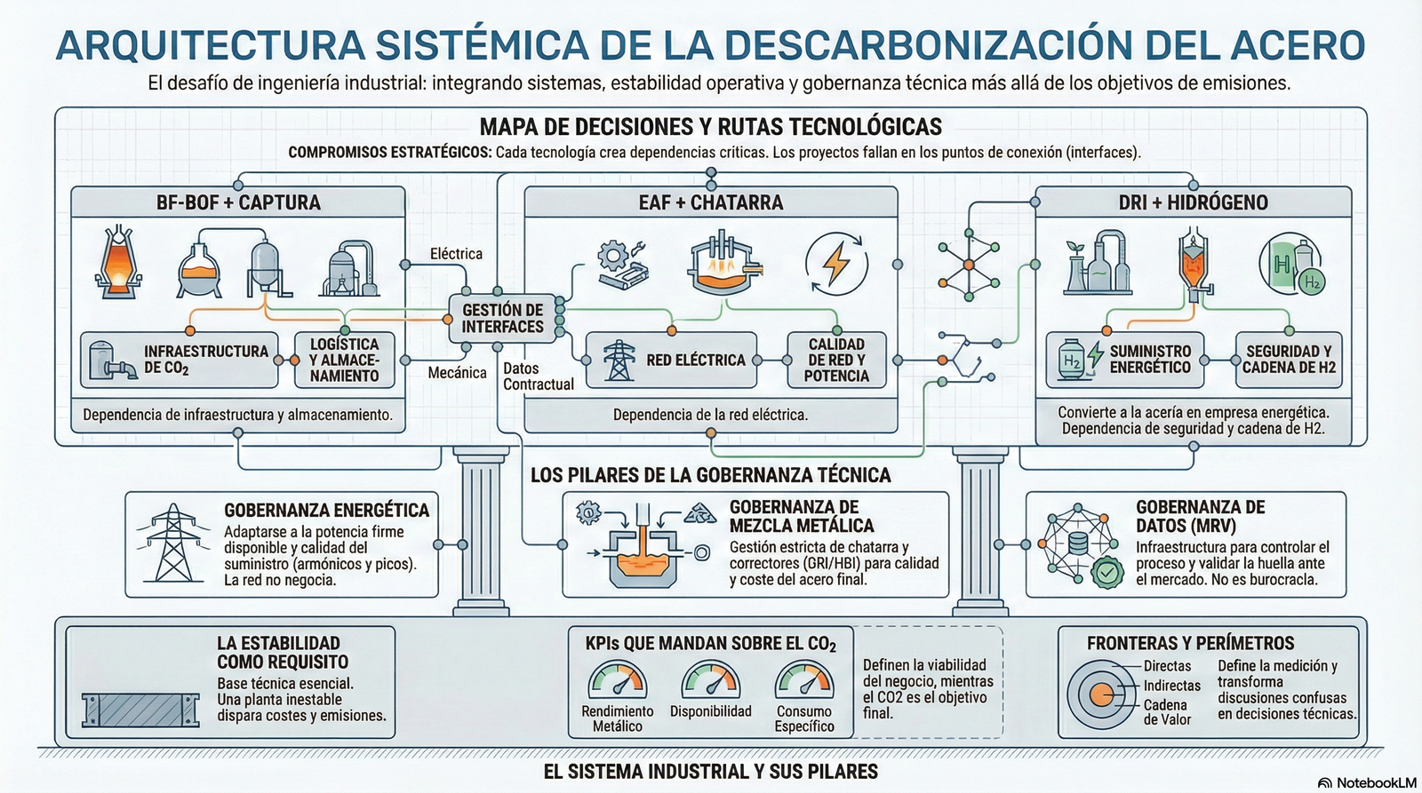 Describe la siderurgia como un sistema integrado de flujos de material, energía y datos. Analiza las diferencias estructurales entre BF–BOF, EAF y DRI–EAF, identificando dónde se concentran las emisiones reales y qué unidades condicionan consumo, permisos y estabilidad. El capítulo introduce la importancia del mapeo de interfaces y de la medición por unidad de proceso para poder gobernar emisiones, costes y cumplimiento ambiental.