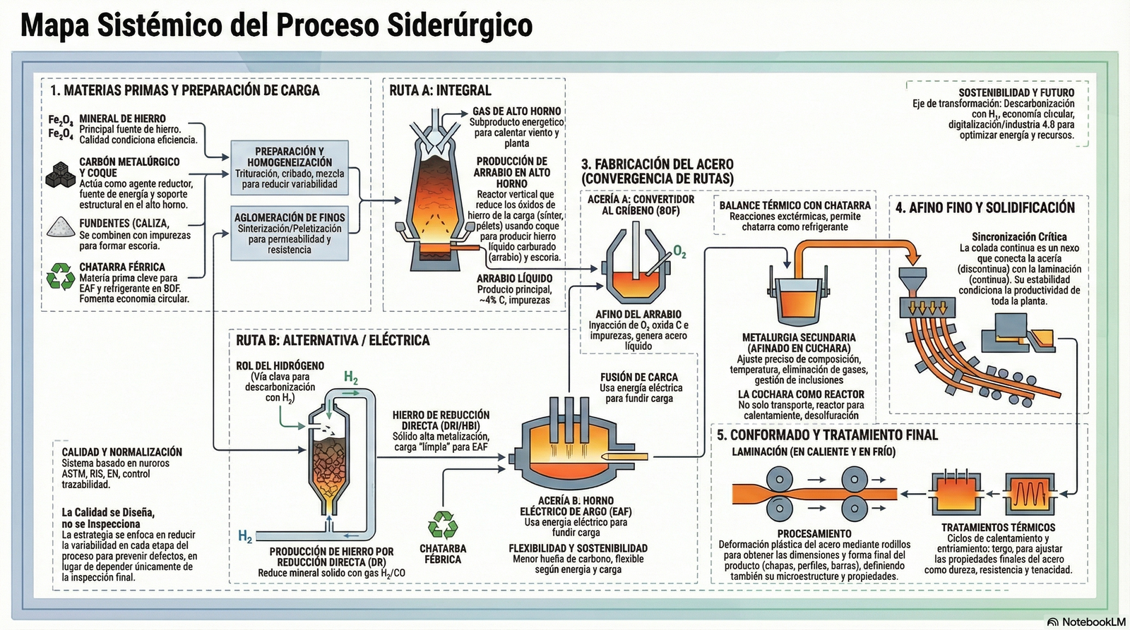 Este capítulo analiza el papel crítico de las materias primas y de la energía en el desempeño global del sistema siderúrgico. Se estudian los minerales de hierro, el coque y el carbón como reductor y soporte estructural, los fundentes para la formación de escoria y la chatarra como elemento clave de circularidad. Se aborda la energía como recurso estratégico, incluyendo el aprovechamiento de gases siderúrgicos y la dependencia eléctrica en rutas EAF. Se pone el foco en la variabilidad de calidad, su impacto en consumo específico, productividad y estabilidad operativa, y en la gestión industrial del suministro, la logística y la recuperación energética.