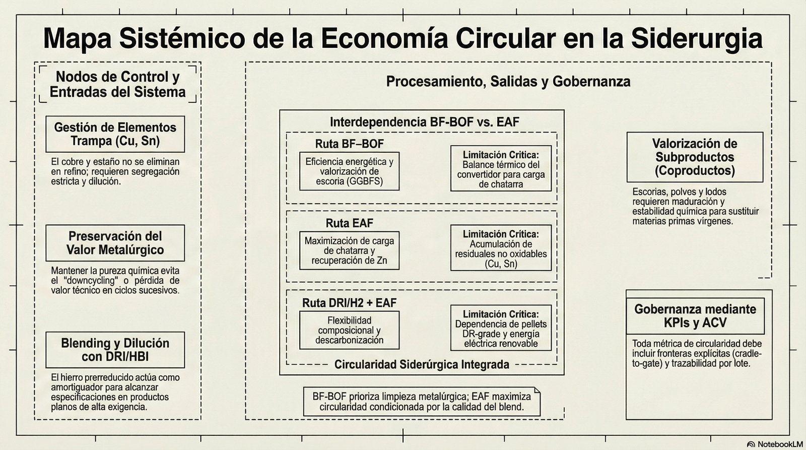 Comparación BF–BOF, EAF y DRI/EAF desde el punto de vista de circularidad y control del sistema.